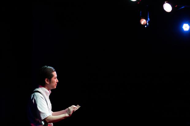 Rather than give us a mere onstage reenactment of Rooney as Yunioshi, what Cho rather ingeniously does instead is depict how he imagines Mickey created the Japanese character, and there’s a method to his madcap madness. In the spirt of Constantin Stanislavski’s, An Actor Prepares, Cho portrays Rooney constructing and getting into the role. At first, the diminutive 40-ish Rooney, (mis)perceiving himself to be a matinee idol, plays Yunioshi as a romantic leading man type. Under studio pressure, when the execs reject this ego-testicle projection of the oft-married Mickey – who was briefly hitched to screen sex siren Ava Gardner 20 years before Tiffany’s was lensed – he reverts to playing Yunioshi as a figure of fun, a kooky kabuki.