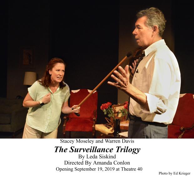 The world premiere of The Surveillance Trilogy is being performed on Mondays, Thursdays, Fridays and Saturdays at 8:00 p.m. and Sundays at 2:00 p.m. through Oct. 14 at Theatre 40 in the Reuben Cordova Theatre, 241 S. Moreno Drive, Beverly Hills, CA 90212. This is on the campus of Beverly Hills High School; there is free parking in a garage near the theatre. For info: (310)364-0535; www.theatre40.org.