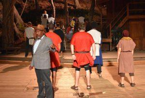 Beneath the wide and starry sky, the cast of dozens is splendidly co-directed by Ellen Geer and Willow Geer (who does double duty, delivering her lines with perfect elocution as Portia, wife of Brutus, played by Christopher W. Jones). One of the things I’ve loved best about the Theatricum is how its productions often make full use of the environment, extending its stage per se offstage into the sylvan glade of Topanga Canyon. In addition to scampering up and down the steep steps (whatever you do dear ticket buyer, don’t stretch your legs out in the aisles, as “Beware the stomping sandals” is number 1 on the amphitheater’s etiquette list!), the patrician and plebian thespians make full use of balconies on the main stage and at stage right, and rather dramatically, in the hilly woods this rustic playhouse is rather splendidly ensconced in. Call it: “Theater in the Surroundings.”