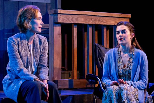 Once the revelry gets underway, there is much drinking. Samuel Garnett turns in a bravura performance as Kevin, who is drunk throughout the entire play. Garnett is the best drunkard I’ve seen depicted since Frank Fontaine as Crazy Guggenheim on TV’s The Jackie Gleason Show and Lee Marvin as Kid Shelleen in the 1965 movie Cat Ballou. Gina’s daughter Emily (Emily James, HBO’s Barry) has some sort of debilitating illness that has her perpetually wracked with pain and hobbling around with a cane – or, is her crippling disability all in her head?