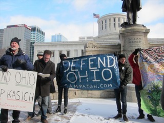 Nearly 300 demonstrators braved chilling temperatures in front of Ohio’s capitol on Saturday, January 8 in order to “defend Ohio” against the incoming administration of John Kasich. A coalition of labor activists, leftists, progressives, and environmentalists wanted the incoming budget hawk to know that they would not stand for the Buckeye State $8 billion deficit being balanced on the backs of poor and working people.