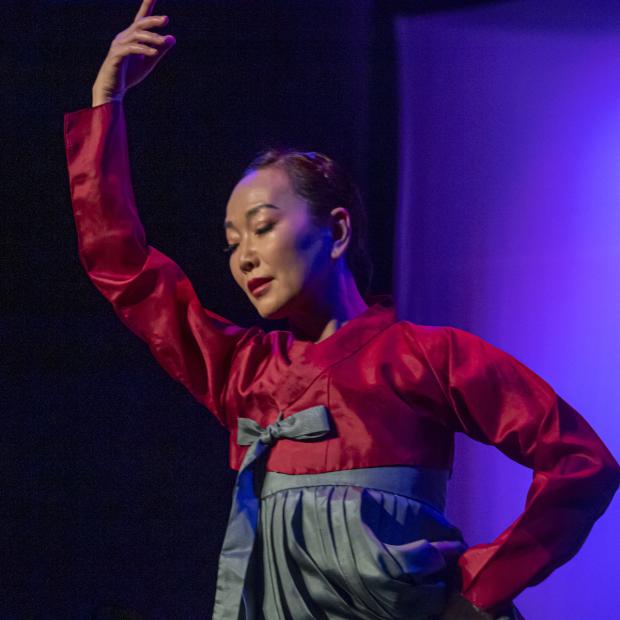 L.A. resident Juli Kim was scheduled to dance, but, alas, she had injured her ankle and was replaced onstage by Jiyoung Choi, who flew in from Seoul to perform Korean dances. Ms. Choi appeared onstage in a traditional, colorful costume, with what looked similar to a cowboy hat slung around her neck. Mounting a two-foot (or so) high drum Jiyoung regaled the audience with a customary Korean drum, arms extended outwards from her sides, holding what looked like flags. At first, I thought she was impersonating a signal officer landing aircraft or going to use semaphore flags to convey words. But I was wrong – she was reenacting a Korean fortuneteller, and went into the audience to predict a few futures based on the colors of the cloths she twirled and unfolded. (As of March 29, I can predict the future: Jiyoung will dance at LAWTF on Saturday, March 30 at 3:00 p.m. Just call me “Criswell Rampell.”)