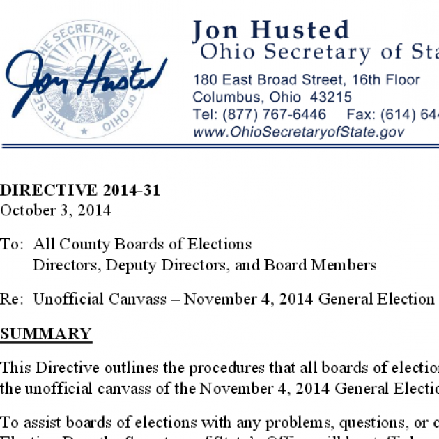 On October 3, Ohio Secretary of State Jon Husted issued a directive that no longer requires county boards of elections to send precinct-by-precinct level data to his office in time-based increments on Election Day. The new requirement...